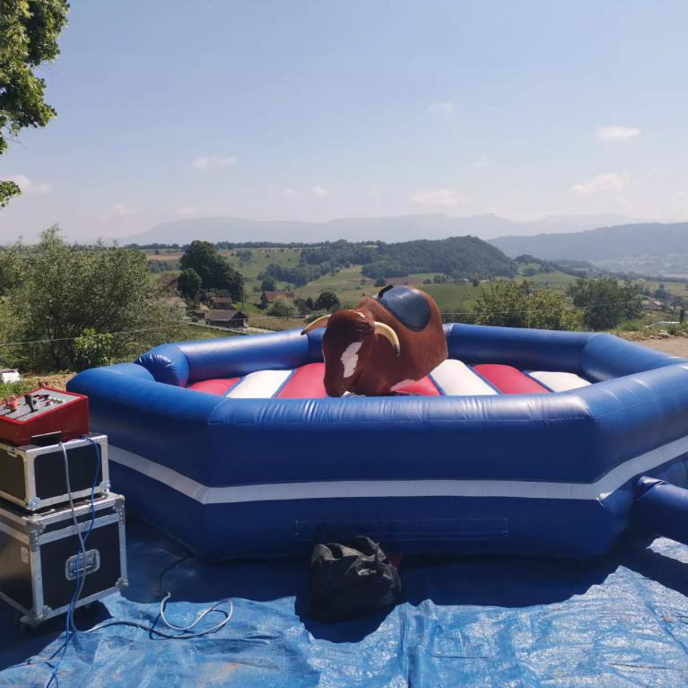 L’objectif est de rester le plus longtemps sur le rodéo en se tenant a la corde Une fois tombé, l’animateur arrête la rotation du taureau mécanique. La personne restant le plus longtemps dessus gagne la partie. le chronomètre permettra de départager les concurrents les plus tenaces et le matelas gonflable qui entoure le taureau amortira les chutes éventuelles. Fou-Rire Garantis !!!!